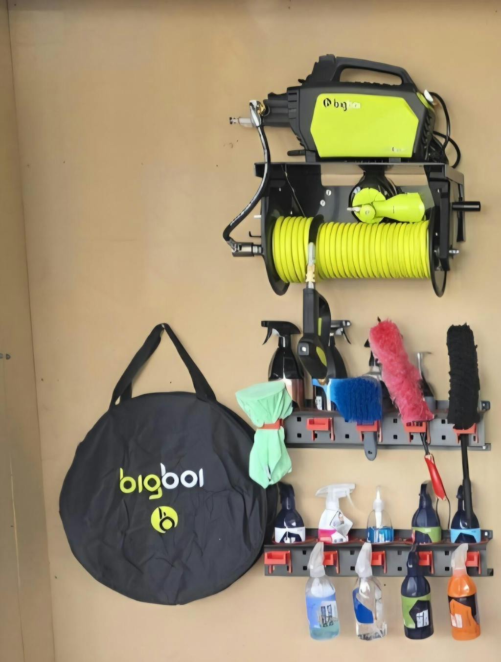 Wall bracket is of solid construction and easy to mount to the wall. It fits the cleaner perfectly. Having all the parts and accessories conveniently stored together works well for cleaning all the cars. Great products by BigBoi.